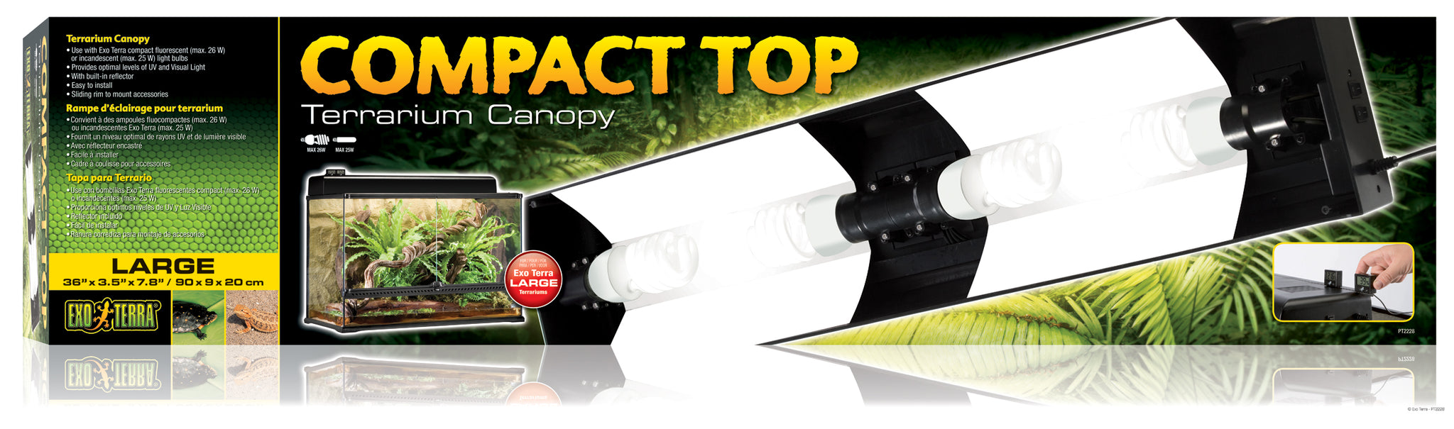 The Exo Terra Compact Top Canopy is a compact fluorescent terrarium canopy designed for use with the Exo Terra Glass Terrarium. This easy-to-install canopy accommodates compact fluorescent bulbs or low wattage incandescent bulbs. A combination of different Exo Terra Repti Glo compact fluorescent bulbs can be used (PT2226 / PT2227 / PT2228) to create the ideal ultraviolet/visual light ratio or a combination with an incandescent light source such as the Daytime Heat Lamp to increase the ambient air-temperature. Optional accessories such as the Exo Terra Digital Thermometer and Hygrometer and the Exo Terra Thermostat and Hygrostat can be slid into the special sliding rim on the top of the canopy.