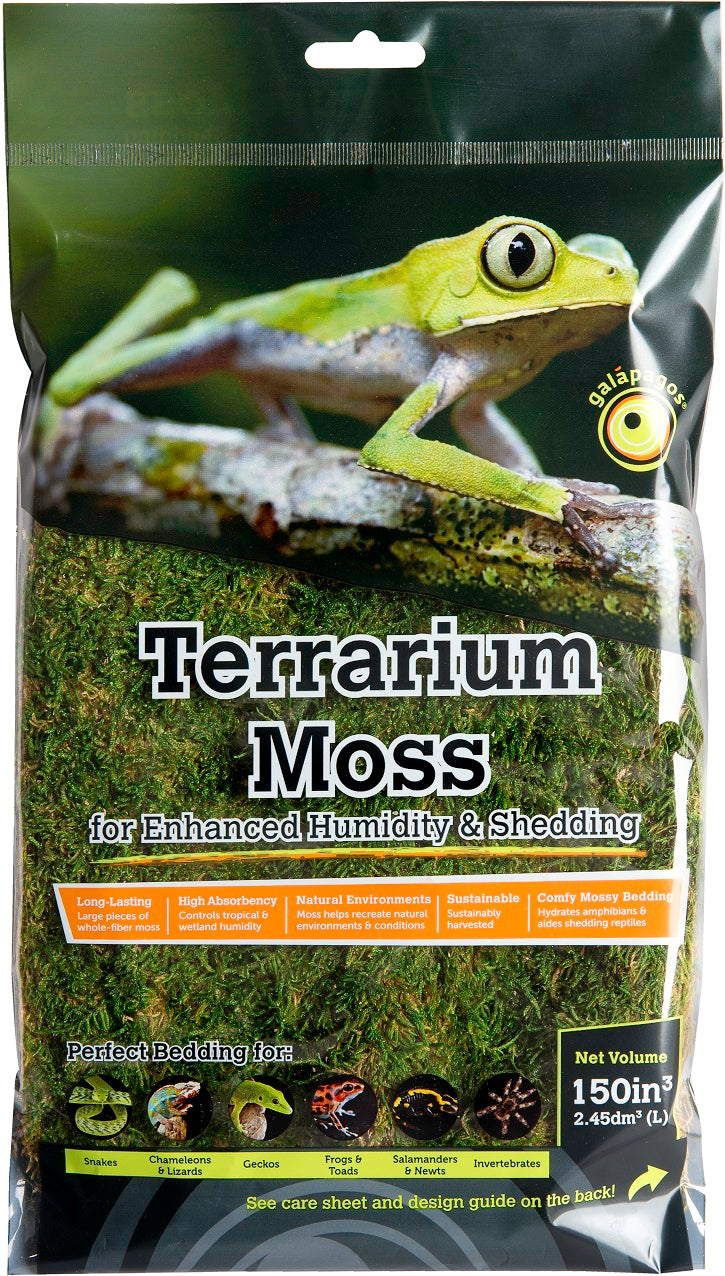 Galápagos' Sheet Moss (8 quarts) is made of soft, flat pieces of real moss that are excellent terrarium accents, beddings, and sources of humidity. Sheet Moss retains moisture and releases it into the air providing a realistic environment for your pets while promoting health and hydration. This product will add a natural feeling to your terrarium, and, in proper conditions, may come back to life!