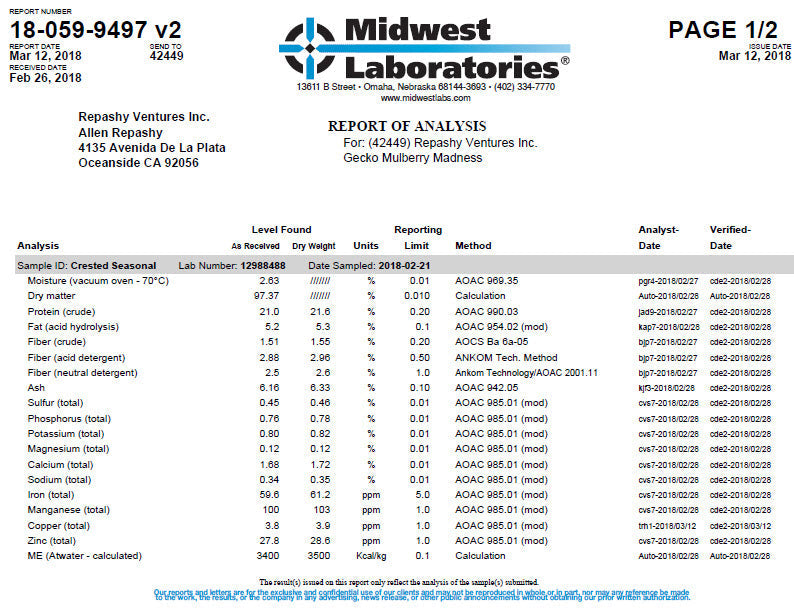 Mulberry Madness will be manufactured in a one-time limited production run, and will be available until August 1, 2018 (if it isn’t sold out much sooner), when we switch to our “Fall Blend”, which may or may not be another gecko formula. Through the summer season, we will be looking for customer input on what the next Seasonal Blend should be. We will be using our Repashy Social media platforms (Facebook and Instagram) to run giveaways, contests, and collaborate with our followers on what fun formulas they would like to see next.